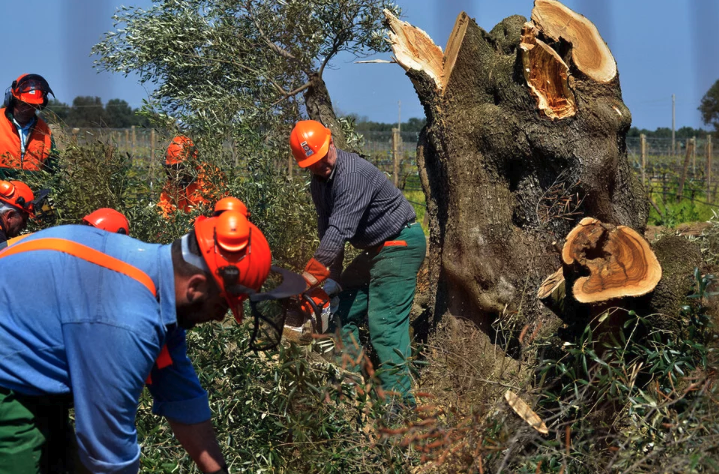 Εργάτες κόβουν ένα ελαιόδεντρο από τα χιλιάδες που έχουν μολυνθεί από ένα θανατηφόρο βακτήριο στη Νότια Ιταλία / Φωτογραφία: AP Photo/Gaetano Loporto