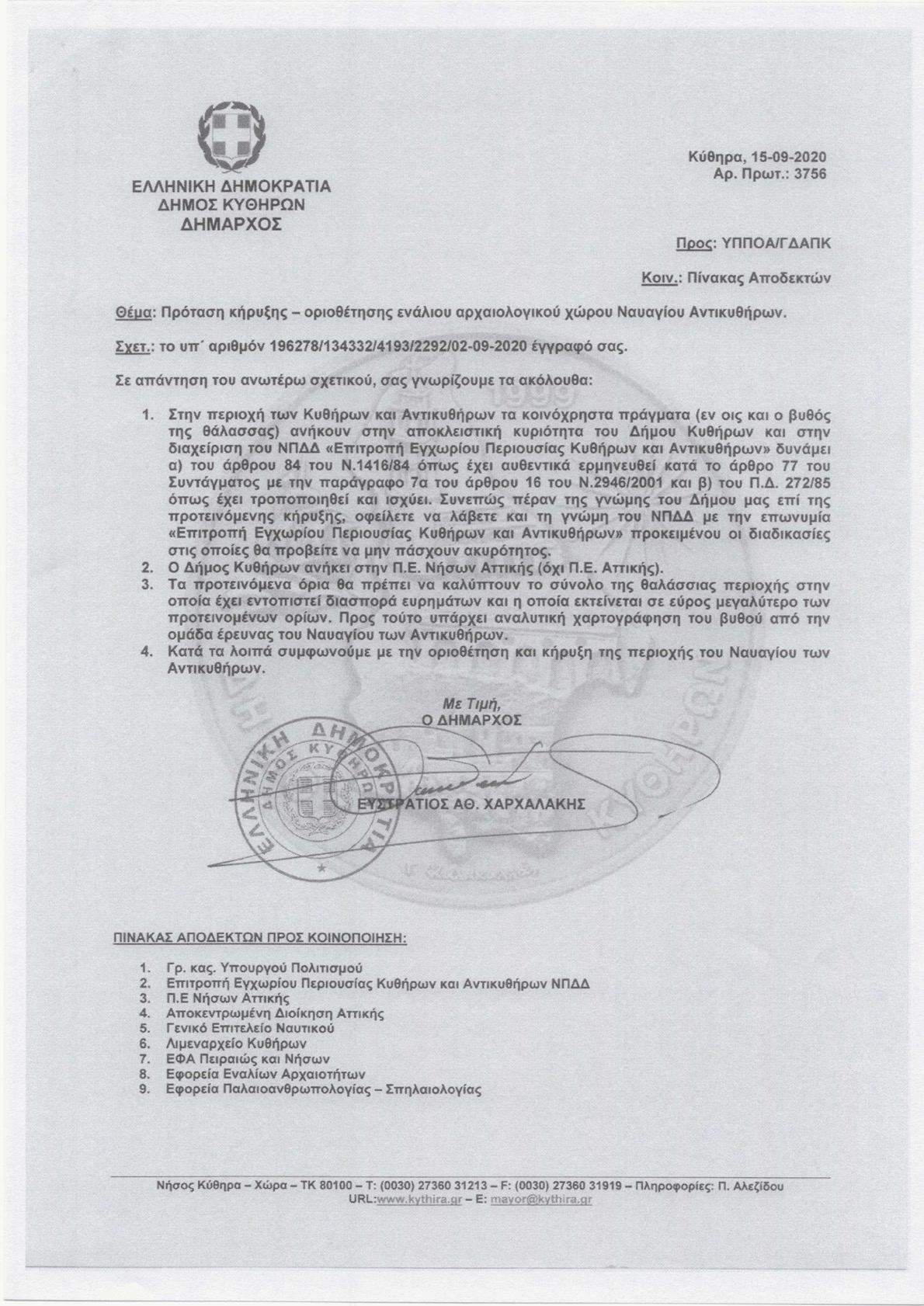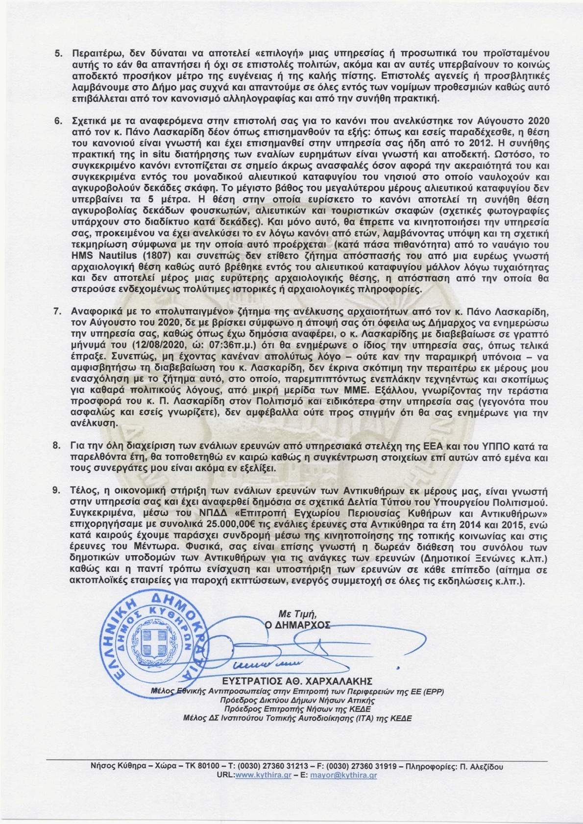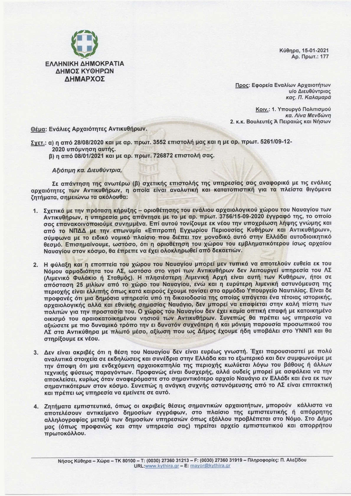Προηγουμένως είχαμε ενημερώσει το Δήμαρχο Κυθήρων για την πρόθεσή μας να δημοσιεύσουμε την επιστολή της Εφορείας Εναλίων και ζητήσαμε να μας ενημερώσει για ενδεχόμενη απάντησή του, ώστε να δημοσιοποιηθεί και αυτή.