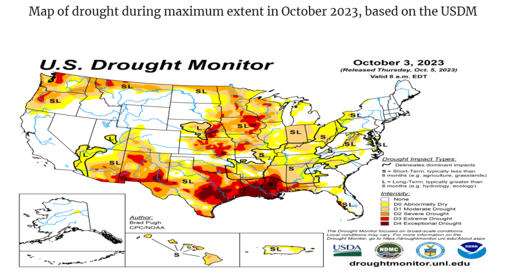 - Στην αναφορά του Σεπτεμβρίου 2023, “Climate Report 2023“, η NOAA αναλύει την κατάσταση της ξηρασίας στις δυτικές πολιτείες των ΗΠΑ, επισημαίνοντας την αυξημένη ένταση και διάρκεια των ξηρασιών σε περιοχές όπως η Καλιφόρνια και το Τέξας, λόγω των μεταβαλλόμενων προτύπων βροχοπτώσεων, (Σχήμα 9).