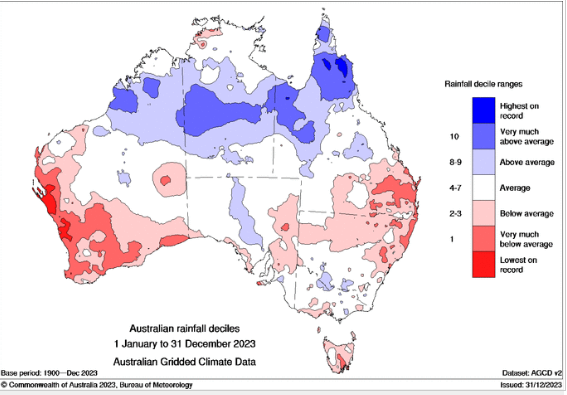 - Στην ετήσια έκθεση για το κλίμα του 2023, “Bureau of Meteorology Australia, 2023“, καταγράφει την επιδείνωση των ξηρασιών στην Αυστραλία, ιδιαίτερα στα νότια και ανατολικά της χώρας, καθώς και την επίδραση της κλιματικής αλλαγής στα επίπεδα των βροχοπτώσεων, (Σχήμα 10).