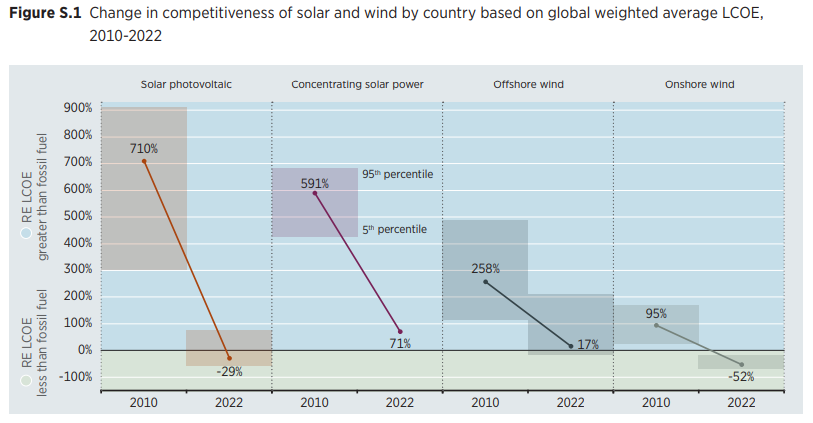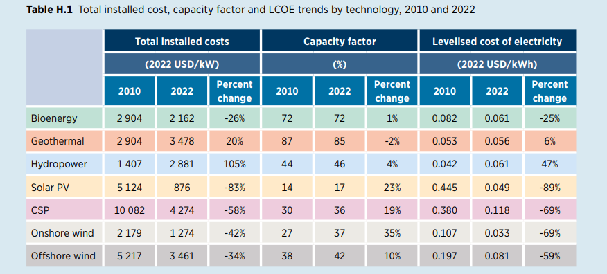 Συγκεκριμένα, οι μειώσεις κόστους για τις κύριες τεχνολογίες Ανανεώσιμων Πηγών Ενέργειας (ΑΠΕ) από το 2010 έως το 2022 είναι οι εξής: