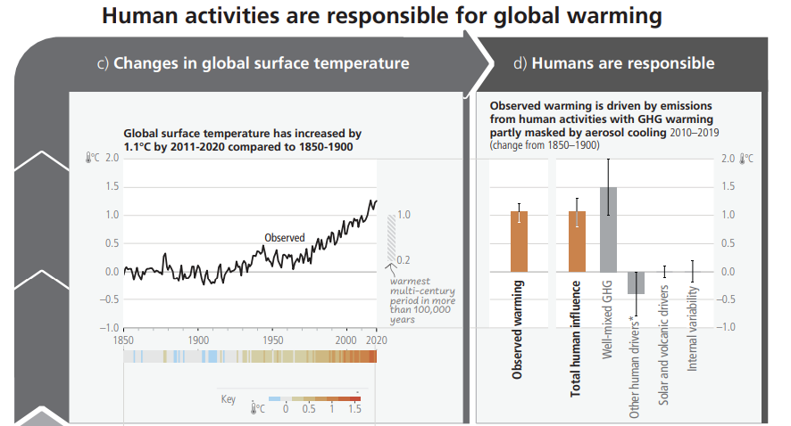 - Επιπέον, στην Έκτη Έκθεση Αξιολόγησης της Διακυβερνητικής Επιτροπής για την Κλιματική Αλλαγή (IPCC), αναφέρεται ότι η παγκόσμια μέση θερμοκρασία έχει αυξηθεί κατά περίπου 1,1°C από την προβιομηχανική περίοδο (1850-1900) έως το 2019, κυρίως λόγω ανθρωπογενών δραστηριοτήτων, όπως η καύση ορυκτών καυσίμων (Σχήμα 4), (Summary for Policymakers της Έκθεσης, συγκεκριμένα στη σελίδα SPM-5, αναφέρεται “Η παγκόσμια επιφανειακή θερμοκρασία ήταν 1,09°C [0,95°C έως 1,20°C] υψηλότερη το 2011–2020 σε σύγκριση με το 1850–1900”. Στην ίδια έκθεση, επισημαίνεται ότι η ανθρωπογενής υπερθέρμανση του πλανήτη αυξάνεται με ρυθμό 0,2°C ανά δεκαετία. Η πληροφορία αυτή βρίσκεται στην ενότητα A.1.3 της Summary for Policymakers).