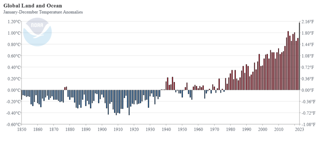 - Σύμφωνα με τη NASA 2024, το έτος 2023 ήταν το θερμότερο στην καταγεγραμμένη ιστορία, με θερμοκρασίες 1,48°C πάνω από τα προβιομηχανικά επίπεδα.
