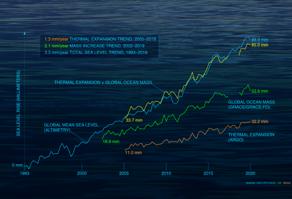 - Στη σελίδα της NASA, Sea Level Change Portal, αναφέρεται ότι η παγκόσμια μέση στάθμη της θάλασσας αυξάνεται με ρυθμό περίπου 3,3 χιλιοστά ανά έτος από το 1993, βάσει δορυφορικών παρατηρήσεων. (NASA Sea Level), (Σχήμα 5).