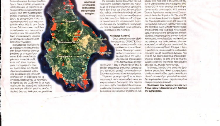 Μεγάλη απάτη, με πλαστογραφίες και είσπραξη άγνωστου ποσού, πιθανόν εκατοντάδων χιλιάδων ευρώ, απεκάλυψε η συνάδελφος ΥΠΑΙΘΡΟΣ ΧΩΡΑ στο φύλλο της τής 22ας Νοεμβρίου. Συγκεκριμένα οι συνεργάτες της εφημερίδας Γεωργία Μπόχτη και Γιάννης Καρτερός έχουν εκτενές ρεπορτάζ για μία μεγάλη απάτη με επιδοτήσεις στο Αγρίνιο που έχει άρωμα …Κυθήρων.