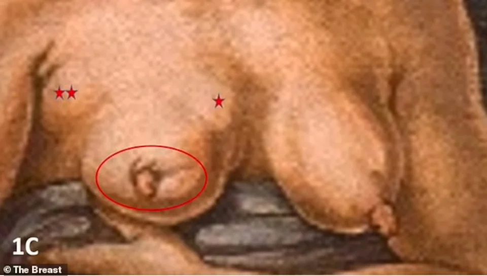 «Αν και ελαφρώς ανυψωμένη από το δεξί της χέρι, υπάρχει μια σημαντικά παραμορφωμένη θηλή. Το περιαρεολικό δέρμα υποχωρεί, το μεσαίο τμήμα της θηλής φαίνεται διαβρωμένο, ενώ το κρανιακό δέρμα της θηλής έχει βαθιά εσοχή και μοιάζει με ουλή».