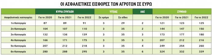 Ακολουθώντας τη λογική που εισάγεται για τους ελεύθερους επαγγελματίες, καθιερώνονται έξι νέες ασφαλιστικές κατηγορίες με προκαθορισμένες για την καθεμιά εξ αυτών εισφορές, μεταξύ των οποίων θα μπορούν να επιλέγουν οι αγρότες. Η πρώτη, που είναι και υποχρεωτική, προβλέπει μηνιαία εισφορά 121 ευρώ για το 2020, 123 ευρώ για το 2021 και 125 ευρώ για το 2022.