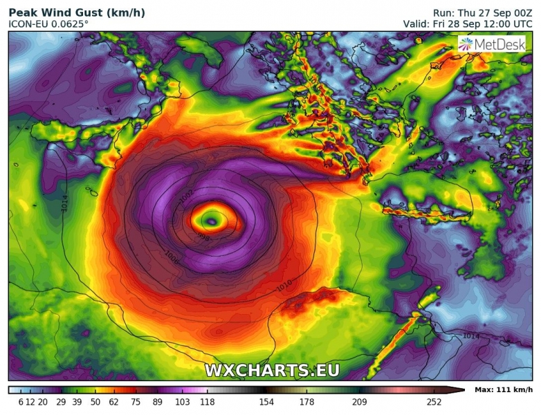 Latest ICON-EU model by @wxcharts showing the #medicane‘s track across central Med into Greece on Saturday and then across Rhodes island into SW Turkey on late Sunday. Severe winds and flash floods are expected!