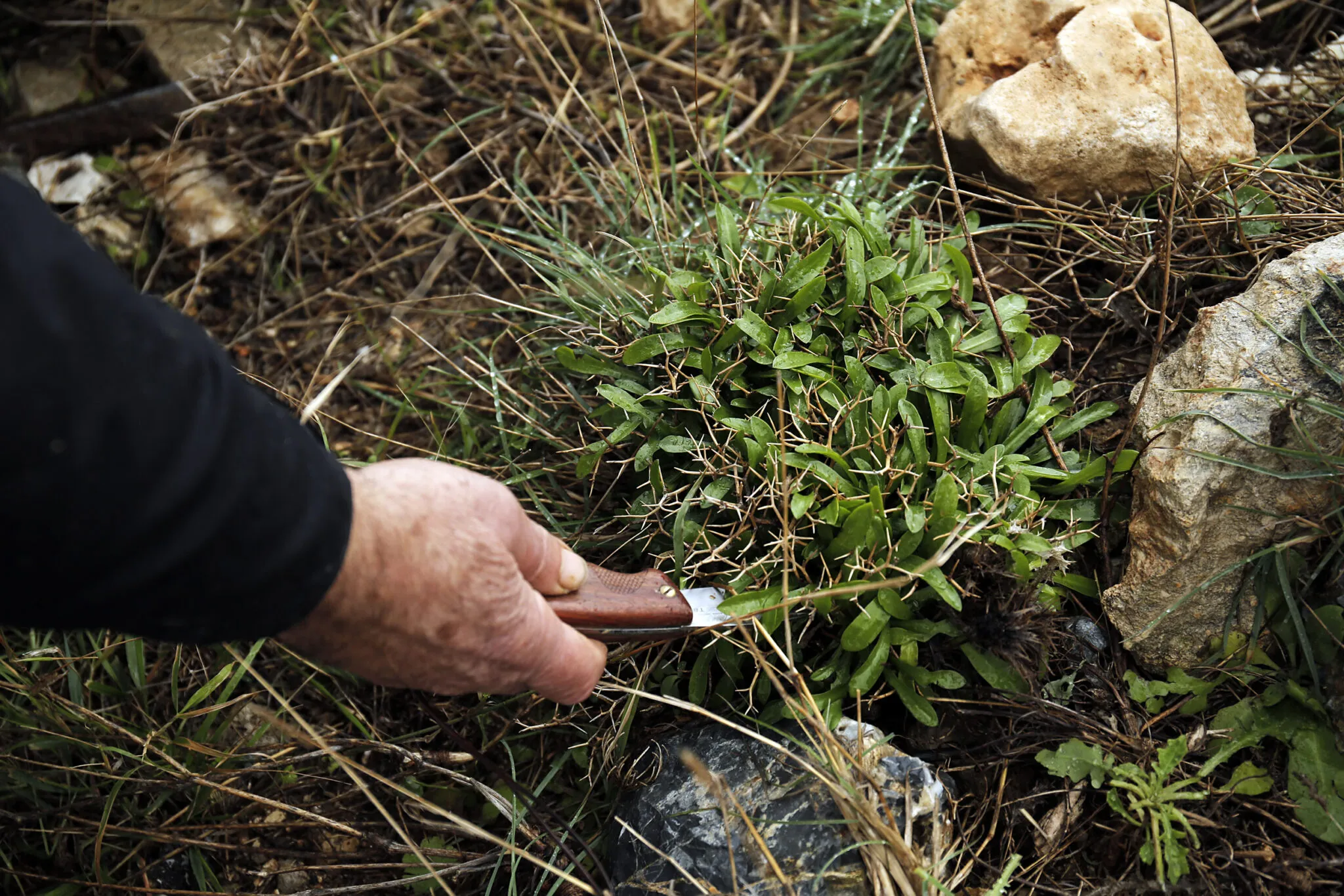 Κατευθυνόμαστε σε ένα παραθαλάσσιο μέρος, λίγα χιλιόμετρα δυτικά του Ρεθύμνου, αν και ο ίδιος μαζεύει χόρτα, ανάλογα με την εποχή, από πολλές διαφορετικές περιοχές, από το βορρά μέχρι το νότο του νομού. Κοιτώντας το ύψωμα μπροστά μας, από το επίπεδο της θάλασσας, ένα απότομο ανέβασμα σε καφετί, σκούρες πράσινες και γκρι αποχρώσεις, δεν είναι εύκολο για τον άπειρο τροφοσυλλέκτη να ξεχωρίσει κάτι ωφέλιμο. Ο Μανώλης προπορεύεται στην απότομη, λασπωμένη αναρρίχηση κατευθυνόμενος προς ένα γνώριμο σε εκείνον σημείο για να ξεκινήσουμε. Κρατώντας με το ένα χέρι τη φωτογραφική μηχανή και προσπαθώντας να μη γλιστρήσω στο υγρό χώμα, τον ακούω να μου εξηγεί.