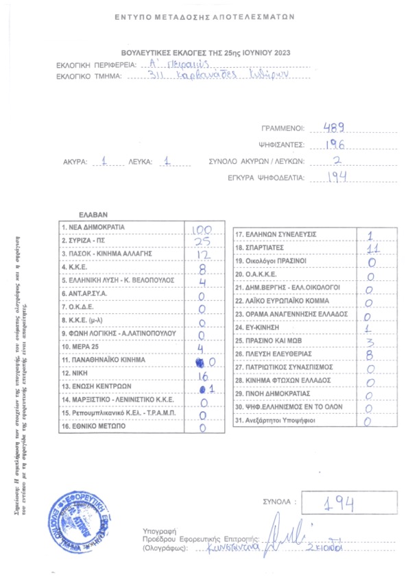 Αποτελέσματα εκλογών 25ης Ιουνίου στις Καρβουνάδες