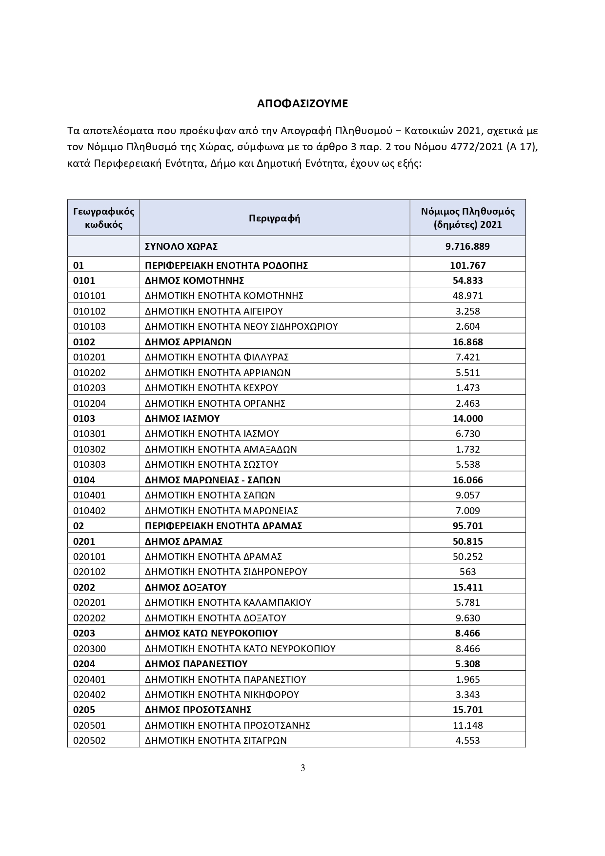 Αποτελέσματα της Απογραφής Πληθυσμού-Κατοικιών έτους 2021 που αφορούν στο Νόμιμο Πληθυσμό (δημότες) της Χώρας.