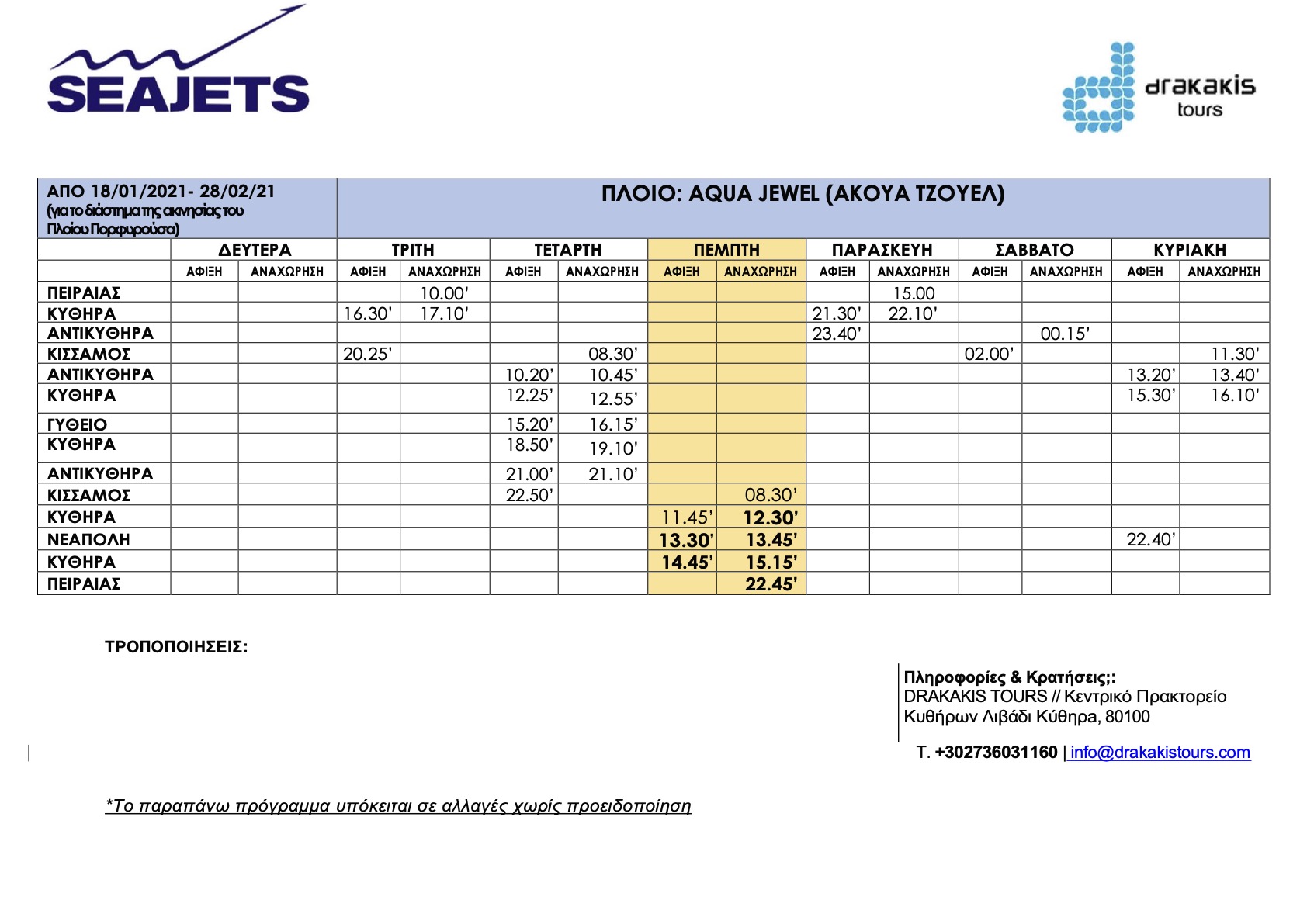 - Aqua Jewel: ΤΡΟΠΟΠΟΙΗΣΗ – ΠΡΟΣΘΗΚΗ ΔΡΟΜΟΛΟΓΙΟΥ ΓΙΑ ΝΕΑΠΟΛΗ ΚΑΙ ΑΝΟΙΧΤΑ ΠΛΑΝΑ ΓΙΑ ΚΡΑΤΗΣΕΙΣ ΜΕΧΡΙ 28/02/2021