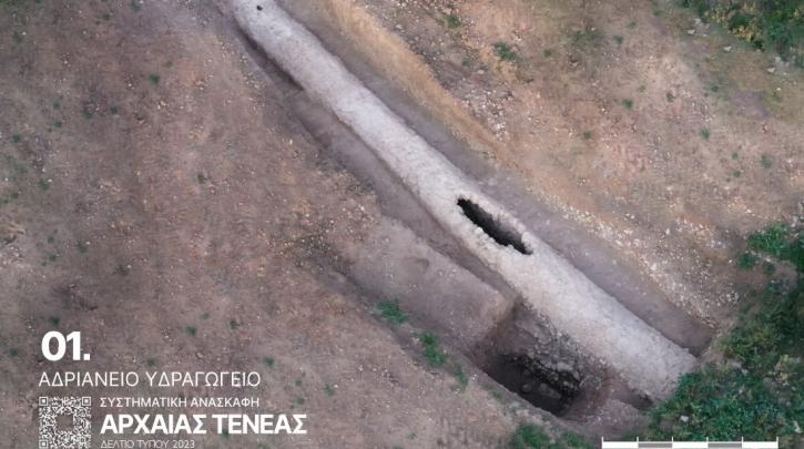 Συγκεκριμένα, όπως αναφέρει σχετική ανακοίνωση του ΥΠΠΟ, τον Οκτώβριο του 2023 ολοκληρώθηκαν οι εργασίες της συστηματικής αρχαιολογικής έρευνας στο Χιλιομόδι Κορινθίας, στο πλαίσιο του ερευνητικού προγράμματος «Αρχαία Τενέα», υπό τη διεύθυνση της αρχαιολόγου δρ Έλενας Κόρκα και με φορέα υλοποίησης τη Διεύθυνση Προϊστορικών και Κλασικών Αρχαιοτήτων του υπουργείου Πολιτισμού. Η ανασκαφή, μεταξύ άλλων, αποκάλυψε για πρώτη φορά φέτος, τμήμα του Αδριάνειου Υδραγωγείου στην περιοχή της αρχαίας Τενέας, προσδιορίζοντας επακριβώς πλέον την πορεία ενός από τα μεγαλύτερα υδραυλικά έργα του 2ου αι. μ.Χ. στον ελλαδικό χώρο, που σκοπό είχε την υδροδότηση της Αρχαίας Κορίνθου από τη Στυμφαλία.