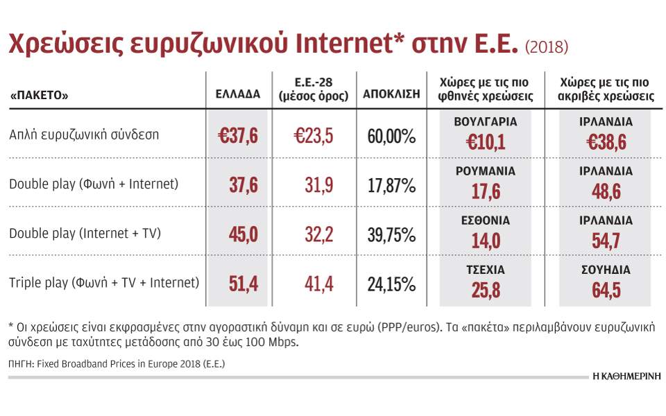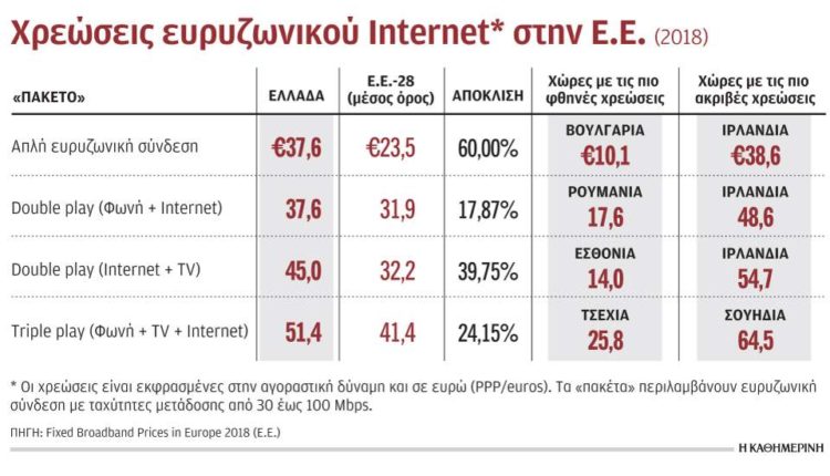 Σύμφωνα με τη μελέτη, η Ελλάδα συγκαταλέγεται στις πιο ακριβές χώρες όσο αυξάνεται η ταχύτητα σύνδεσης στο Διαδίκτυο. Στα πακέτα που περιλαμβάνουν συνδέσεις άνω των 100 (και έως 200 Mbps) η Ελλάδα είναι συνήθως η πιο ακριβή και οι αποκλίσεις στις χρεώσεις διευρύνονται. Για παράδειγμα, για ένα πακέτο double play (Internet+TV) με σύνδεση άνω των 100 Mbps, στην Ελλάδα η χρέωση είναι υπερδιπλάσια του μέσου όρου της Ε.Ε. Συγκεκριμένα, εκφρασμένο σε μονάδες αγοραστικής δύναμης, ξεπερνά τα 90 ευρώ τον μήνα, όταν o μέσος όρος στην Ε.Ε. είναι 43,7 ευρώ. Αντίστοιχα ισχύουν και για άλλα πακέτα (single play, triple play κ.λπ.). Μικρότερες είναι οι αποκλίσεις, όταν αναφερόμαστε σε πακέτα που περιλαμβάνουν συνδέσεις με χαμηλές ταχύτητες (12-30 Mbps). Στα συγκεκριμένα πακέτα οι χρεώσεις στη χώρα μας είναι στα επίπεδα του μέσου όρου ή και οριακά χαμηλότερα.