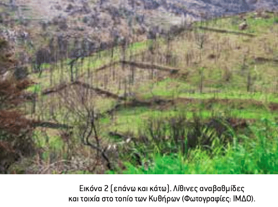 Το νησί των Κυθήρων είναι το σταυροδρόμι των πολιτισμών της Μεσογείου. Η φωτιά που προκλήθηκε το 2017 αποκάλυψε τις λίθινες αναβαθμίδες και τα τοιχία (Εικόνα 2), έργα τα οποία μετράνε εκατοντάδες έτη ζωής. Η συντήρηση και η επέκτασή τους συνεχίζονταν έως τη δεκαετία του 1960, καθώς αποτελούν στοιχεία της ελληνικής υπαίθρου και χαρακτηριστικά του ελληνικού τοπίου. Σύμφωνα με την Κουλούρη (2004)[5] οι αναβαθμίδες αποτελούν, ιστορικά, μια από τις πιο σημαντικές και χαρακτηριστικές παρεμβάσεις του ανθρώπου στη διαμόρφωση του Μεσογειακού τοπίου. Αποτελούν ένα σημαντικότατο στοιχείο της ιστορικής και πολιτιστικής κληρονομιάς των Μεσογειακών λαών και ταυτόχρονα ένα στοιχείο μεγάλης αισθητικής και περιβαλλοντικής αξίας.