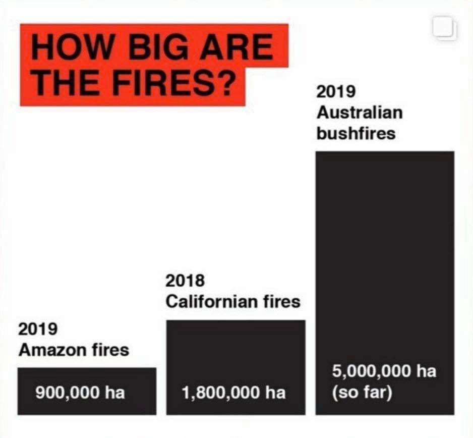 Πόσο μεγάλες είναι οι πυρκαγιές στην Αυστραλία; Το γράφημα δίνει μία εικόνα. Οι φωτιές στον Αμαζόνιο, το 2019, κατέκαψαν εννέα εκατ. στρέμματα, στην Καλιφόρνια, το 2018, 18 εκατ. στρέμματα, και στην Αυστραλία, από τον Σεπτέμβριο, 50 εκατ. στρέμματα. Σύμφωνα με τις προβλέψεις των ειδικών, οι πυρκαγιές δεν πρόκειται να σβήσουν τουλάχιστον μέχρι τέλη του Ιανουαρίου