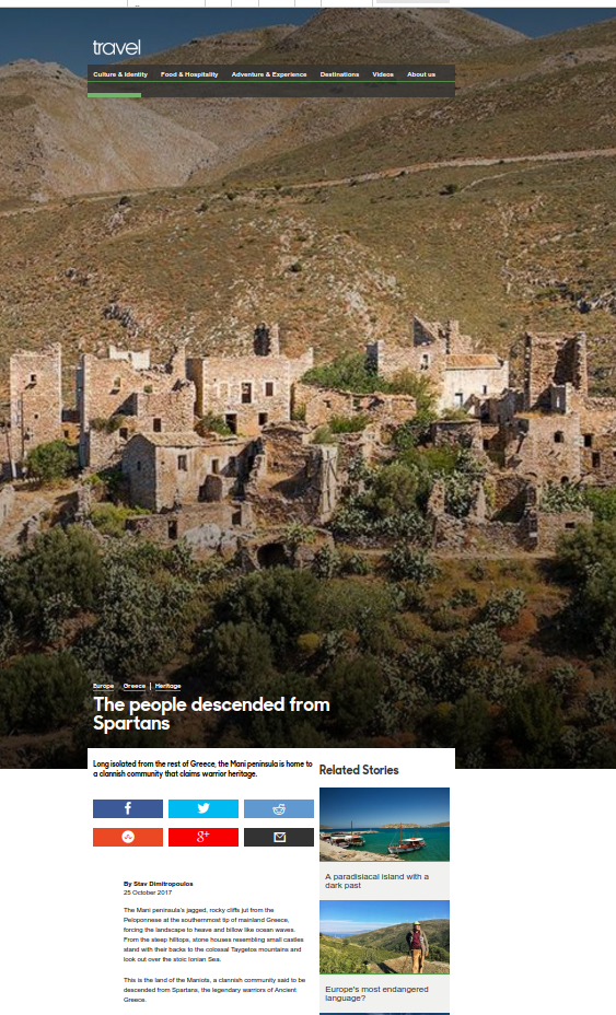 «Αυτή είναι η γη των Μανιατών, μιας μικρής κοινωνίας που λέγεται ότι προέρχεται από τους Σπαρτιάτες, τους θρυλικούς μαχητές της Αρχαίας Ελλάδας» γράφει ο δημοσιογράφος Σταβ Δημητρόπουλος.