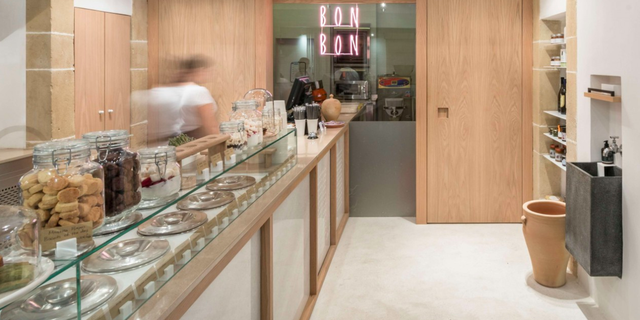 Η εταιρία Interior Design Laboratorium διαμόρφωσε το χώρο έτσι, ώστε να συνδυάζει τις ομορφιές ενός νησιού με τη γοητεία μιας ευρωπαϊκής μεγαλούπολης. Το Bon Bon Fait Maison στεγάζεται σ’ ένα διώροφο, παραδοσιακό κτίριο που χρονολογείται τη δεκαετία του 1860, το οποίο ανακαινίστηκε με τη βοήθεια της ντόπια αρχιτεκτονικής εταιρίας m3kythira. Το σχέδιο είναι εμπνευσμένο από την Ελλάδα, το ελληνικό καλοκαίρι και τη νησιώτικη ζωή και έχει στόχο να αφυπνίσει στους επισκέπτες μνήμες από τα παιδικά καλοκαίρια τους.