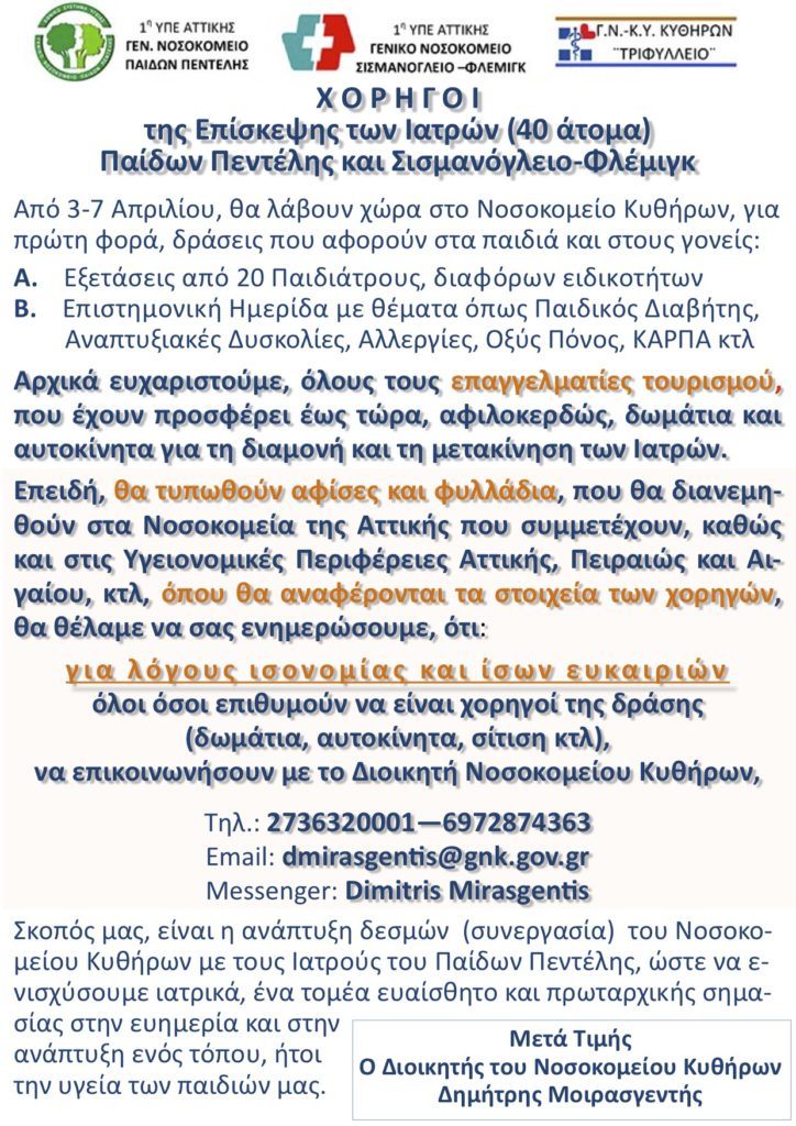 Χορηγοί για τη πραγματοποίηση της επίσκεψης ιατρών του πάιδων Πεντέλης στα Κύθηρα 3-7 Απριλίου