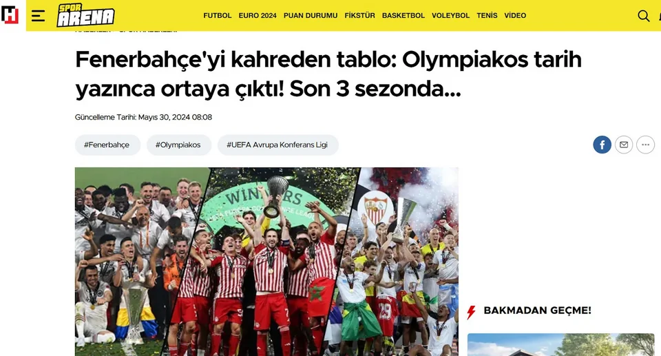 Ο τουρκικός Τύπος σχολιάζει τον ελληνικό θρίαμβο, με την Huriyyet να επισημαίνει ότι «ο Ολυμπιακός, ο οποίος απέκλεισε τη Φενέρμπαχτσε στα προημιτελικά του UEFA European Conference League, νίκησε τη Φιορεντίνα με γκολ στην παράταση στον τελικό αγώνα που διεξήχθη στην Ελλάδα και κατέκτησε το πρώτο Ευρωπαϊκό τρόπαιο στην ιστορία του. Μετά από αυτή τη νίκη, προέκυψε μια εικόνα που συγκλόνισε τους οπαδούς της Φενέρμπαχτσε».