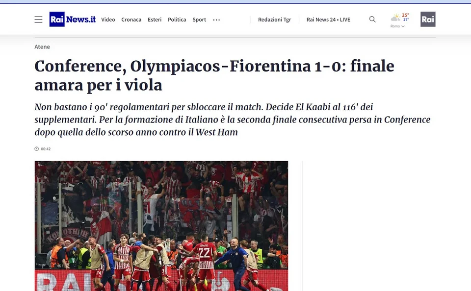«Απόψε η Φιορεντίνα αντιμετώπισε τον Ολυμπιακό στον τελικό του Conference League για να πάρει εκδίκηση στο όνομα του Τζο Μπαρόνε. Οι “βιόλα”, μετά την ήττα στον περσινό τελικό στην Πράγα από την αγγλική Γουέστ Χαμ, κυνηγούσαν την εξιλέωση στον δεύτερο διαδοχικό τελικό (έκτο στην Ευρώπη) για να επαναφέρουν έναν ευρωπαϊκό τίτλο που λείπει από τη Φλωρεντία από το 1961» ,έγραψε η ιταλική Rai.