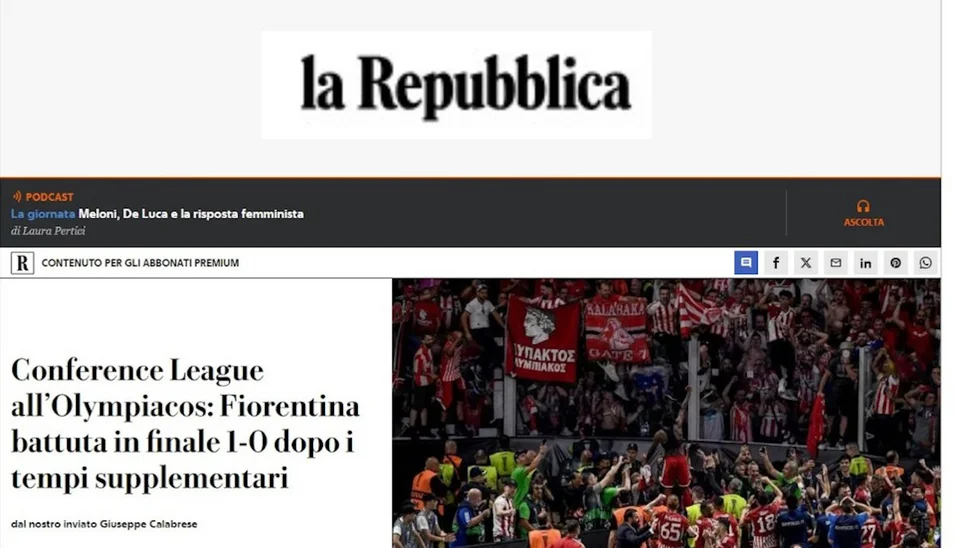 H Ιταλική La Repubblica αναγνώρισε την υπεροχή του Ολυμπιακού και την ανωτερότητα του Ελ Κααμπί. Η ιταλική εφημερίδα, επισήμανε ότι «οι “βιόλα” παραδόθηκαν στην τελευταία πράξη για δεύτερη συνεχόμενη χρονιά»