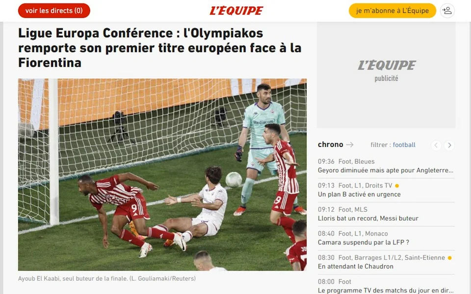 «Χάρη σε ένα γκολ του Ayoub El Kaabi στην παράταση, ο Ολυμπιακός κέρδισε το βράδυ της Τετάρτης τη Φιορεντίνα στον τελικό του UEFA Europa League (1-0). Ο πρώτος ευρωπαϊκός τίτλος για ελληνικό σύλλογο», επισημαίνει η γαλλική l’ Equipe.