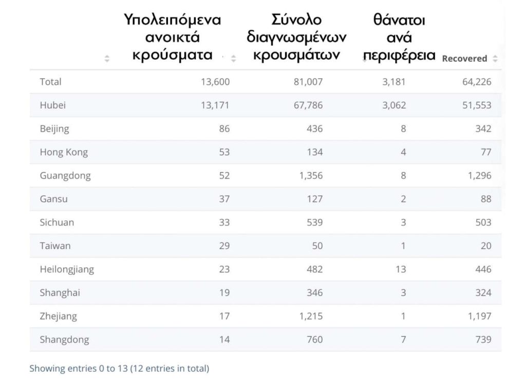 Πίνακας Ι: Υπολειπόμενα ανοικτά κρούσματα, σύνολο διαγνωσμένων κρουσμάτων και θάνατοι ανά περιφέρεια της Κίνας εδώ.