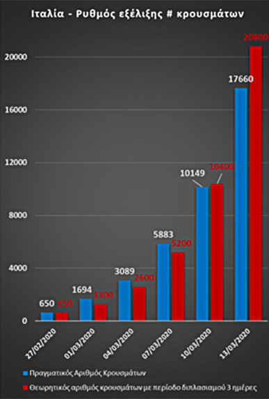 Η εξέλιξη του αριθμού διαγνωσμένων κρουσμάτων στην Ιταλία, την περίοδο 27/2-13/3, αποτελεί ένα καλό παράδειγμα εκθετικής αύξησης με περίοδο διπλασιασμού περίπου 3 ημέρες (Διάγραμμα ΙΙ).