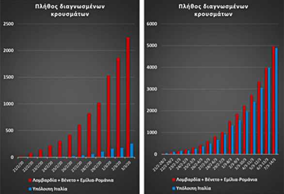 Στα διάγραμμα ΙΙΙα (αριστερά) βλέπουμε με κόκκινο χρώμα τα διαγνωσμένα κρούσματα στις τρεις επιλεγμένες περιφέρειες και με μπλε στην υπόλοιπη Ιταλία (περίοδος 21/2-3/3) πηγή, Wikipedia)