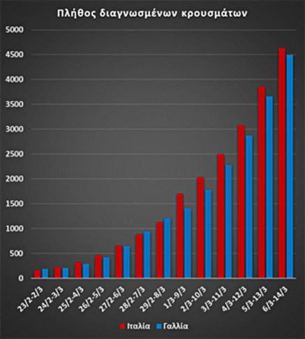 Διάγραμμα IV: Διαγνωσμένα κρούσματα σε Ιταλία και Γαλλία. Στα κρούσματα της Ιταλίας έχει γίνει μια μετάθεση κατά 8 ημέρες. Έτσι η 1η παρατήρηση αφορά στα διαγνωσμένα κρούσματα της Ιταλίας στις 23/2 και της Γαλλίας στις 2/3. Αντίστοιχα, η τελευταία παρατήρηση αφορά την 6/3 & 14/3.