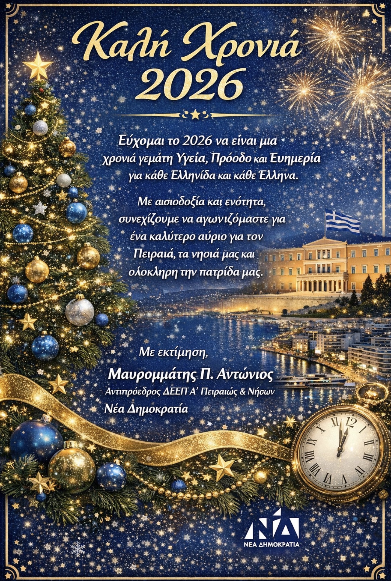 Εύχομαι το 2026 να είναι μια χρονιά γεμάτη Υγεία, Πρόοδο και Ευημερία για κάθε Ελληνίδα και κάθε Έλληνα. Με αισιοδοξία και ενότητα, συνεχίζουμε να αγωνιζόμαστε για ένα καλύτερο αύριο για τον Πειραιά, τα νησιά μας και ολόκληρη την πατρίδα μας.