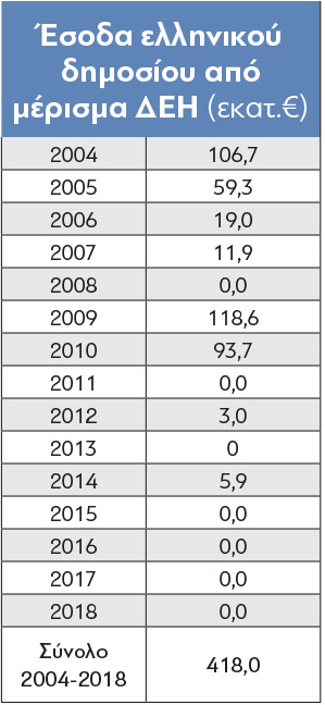 Στον πίνακα ΙΙ φαίνονται τα μερίσματα που απέδωσε η ΔΕΗ στο Δημόσιο και στον έλληνα φορολογούμενο από το 2004 ως το 2018. Το μέρισμα της 15ετίας φτάνει στα 400 εκατ.€. Ελάχιστα παραπάνω, δηλαδή, από τα 360 εκατ.€ που κατέβαλε ο φορολογούμενος στη ΔΕΗ το 2017, προκειμένου να ενισχύσει τη ρευστότητα της εταιρείας. Και, όπως διαβάζουμε, ο φορολογούμενος θα καταβάλει σύντομα στην εταιρεία άλλα 200 εκατ.€ στα πλαίσια εξόφλησης εκκρεμών οφειλών ΥΚΩ.