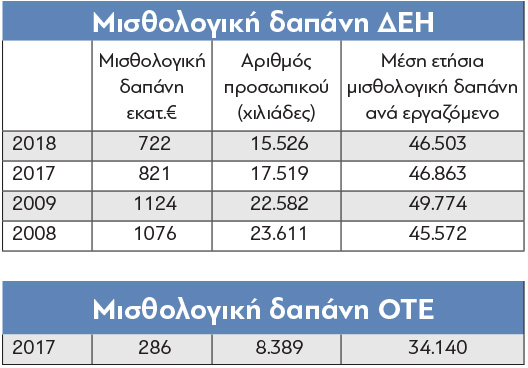 Για τη μισθοδοσία ανά εργαζόμενο η ΔΕΗ δαπανά 50% περισσότερα από το ελληνικό Δημόσιο, το οποίο γενικά θεωρείται «καλός» εργοδότης. Αλλά και με την ΟΤΕ Α.Ε. συγκρινόμενη, η μισθολογική δαπάνη ανά εργαζόμενο στον όμιλο ΔΕΗ το 2017 ήταν 37% υψηλότερη. (Συγκρίνουμε με την εταιρεία ΟΤΕ Α.Ε. και όχι με τον όμιλο, διότι ο όμιλος ΟΤΕ απασχολεί πολλούς εργαζόμενους σε Ρουμανία & Αλβανία, όπου το μισθολογικό κόστος είναι πολύ χαμηλότερο, οπότε μια τέτοια σύγκριση θα «αδικούσε» τη ΔΕΗ.)