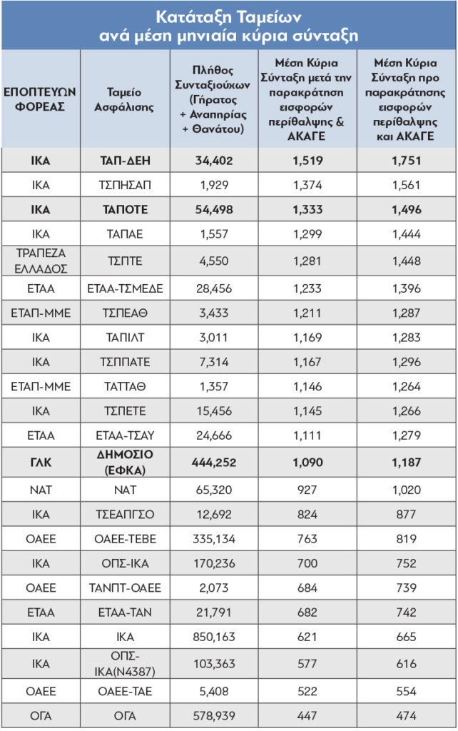 4Από τον πίνακα έχουν εξαιρεθεί 10 ταμεία που έχουν λίγους δικαιούχους (<1000). Ένα εξ’ αυτών, το οποίο όμως αριθμεί μόνον 21 συνταξιούχους, έχει υψηλότερη μέση σύνταξη από τη ΔΕΗ.