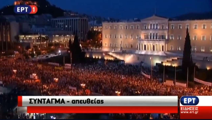Το ίδιο βράδυ πραγματοποιείται η συγκέντρωση υπέρ της κυβέρνησης στο Σύνταγμα (YouTube/ ΕΡΤ):