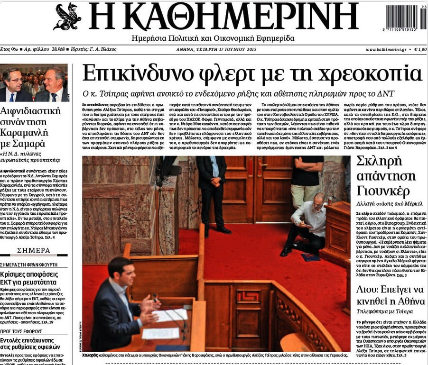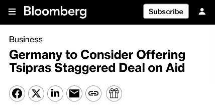 Το περίεργο τηλεγράφημα. Η επόμενη μέρα της τριμερούς φέρνει κλίμα συγκρατημένης αισιοδοξίας. Τα «Νέα» κυκλοφορούν με τίτλο «Παράθυρο Συμφωνίας» (εδώ). Ωστόσο ανάμεσα στις γραμμές κάτι μοιάζει να μην πηγαίνει καλά. Τηλεγράφημα του Bloomberg με τίτλο Germany to Consider Offering Tsipras Staggered Deal on Aid, περνάει μια πρώτη εικόνα ότι η Γερμανία εξετάζει κάποιου είδους άγνωστη μέχρι τότε «βοήθεια» για την Ελλάδα.