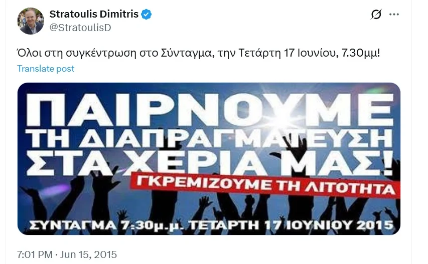 Η ανάρτηση-κάλεσμα του αναπληρωτή υπουργού Εργασίας του ΣΥΡΙΖΑ, Δημήτρη Στρατούλη, για τις 17/6/2015 στο Σύνταγμα και το μπάνερ τού «Μένουμε Ευρώπη» για συγκέντρωση την ίδια ώρα στο ίδιο μέρος την επομένη: