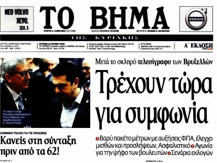 Το πρωτοσέλιδο του «Βήματος της Κυριακής» στις 14 Ιουνίου 2015: