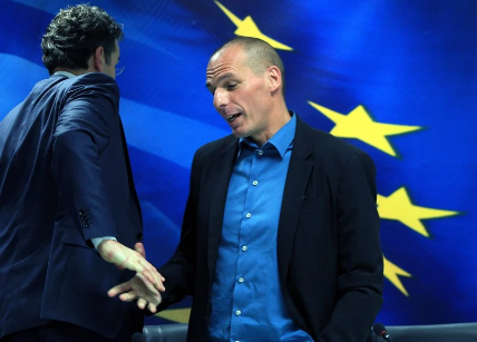 Βαρουφάκης – Ντάισελμπλουμ στο υπουργείο Οικονομικών επί της οδού Νίκης στο Σύνταγμα στις 30 Ιανουαρίου 2015, λίγες μέρες μετά τις εθνικές εκλογές της 25ης Ιανουαρίου που κέρδισε ο ΣΥΡΙΖΑ. Τις μέρες εκείνες η πλατεία Συντάγματος γεμίζει με διαδηλωτές που υποστηρίζουν την κυβέρνηση στη διαπραγμάτευση με την τρόικα (EPA/SIMELA PANTZARTZI)