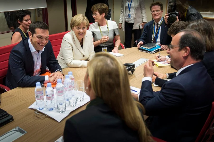 Συνάντηση Τσίπρα με Μέρκελ και Ολάντ στις Βρυξέλλες. Ο εκ νέου εναγκαλισμός Τσίπρα-Γιούνκερ μοιάζει να αποκαθιστά τη σχέση μετά τη φραστική ανταλλαγή. Ωστόσο τίποτα νέο δεν προκύπτει επί της ουσίας και ξεχωρίζει ο δραματικός τόνος της δήλωσης της γερμανίδας καγκελαρίου: «Ο στόχος είναι να παραμείνει η Ελλάδα στην ευρωζώνη. Πάντα προσεγγίζω αυτά τα πράγματα με τη στάση ότι αν υπάρχει θέληση, υπάρχει και τρόπος». Το πρώτο μέρος της δήλωσης αποτελεί προοίμιο για όσα θα ακολουθήσουν.