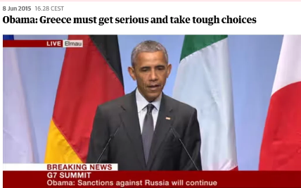 Την ίδια ημέρα, ο πρόεδρος των ΗΠΑ, Μπαράκ Ομπάμα, δηλώνει σε συνέντευξη Τύπου (στη Σύνοδο Κορυφής των G7 στη Γερμανία) ότι η Ελλάδα πρέπει να αντιμετωπίσει με σοβαρότητα το ζήτημα, να λάβει δύσκολες αποφάσεις και να υλοποιήσει μεταρρυθμίσεις.