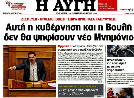 Η «Αυγή» στέκεται στη δήλωση του Πρωθυπουργού Α. Τσίπρα ότι «αυτή η κυβέρνηση και αυτή η Βουλή δεν θα ψηφίσουν νέο Μνημόνιο»:
