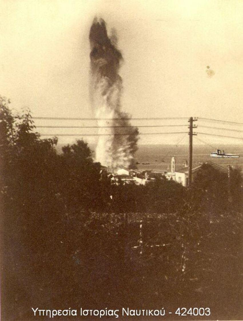 Ένας ψίθυρος από άκρη σε άκρη σε όλο το νησί. Η δεύτερη έκρηξη ήταν ισχυρότερη. Έσκασε το καζάνι, ο λέβητας, κάτω από την ίσαλο γραμμή του πλοίου και μια τρύπα διαμέτρου δύο μέτρων ανάμεσα στα δύο φουγάρα, έγινε ορατή ακόμη και από την ακτή. Καπνός …μαύρος πυκνός καπνός κάλυψε τον ουρανό πάνω από το πλοίο. Οι ναύτες πηδούσαν από το κατάστρωμα να σωθούν. Οι φλόγες έβγαιναν απειλητικές από τα σωθικά του καραβιού. Στην προκυμαία ο κόσμος δεν πίστευε αυτό που έβλεπε. Οι βάρκες που πλησίαζαν τα δύο επιβατηγά ατμόπλοια για να παραλάβουν τους επιβάτες, έμειναν με τα κουπιά όρθια. Η απόλυτη καταστροφή. Μετά τις εκρήξεις μια σιωπή έπεσε στο λιμάνι…ακουγόταν μόνο ο αέρας και από μακριά τα ουρλιαχτά των τραυματισμένων ναυτών…