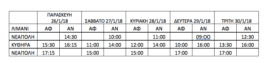 Προς εξυπηρέτηση των Κυθήρων από την Παρασκευή 26/01/2018 έως και την Τρίτη 30/01/2018 το πλοίο θα εκτελέσει τα δρομολόγια από Νεάπολη – Κύθηρα και επιστροφή ως εξής:
