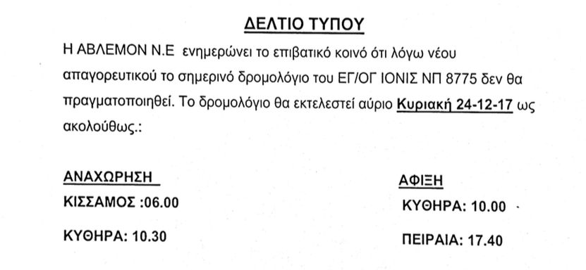 Δελτίο Τύπου – ΑΒΛΕΜΟΝ ΝΕ – Πραγματοποίηση δρομολογίου ΙΟΝΙΣ από Κίσσαμο την Κυριακή 24/12/2017