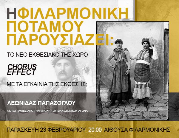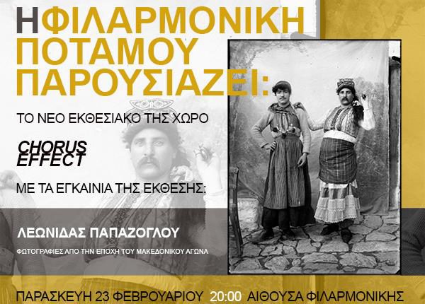 Ελάτε να υποστηρίξετε την Φιλαρμονική σε αυτή την εκδήλωση που θα γίνει στον χώρο της στον Ποταμό. Πρόκειται για την αίθουσά μας, πάνω από το Πνευματικό Κέντρο, στην οποία κάνουμε τις πρόβες μας, τα μαθήματα, τις παρουσιάσεις, τις προβολές. Τρείς καλλιτέχνες, ο Βάλερυ Μπολότιν, η Μαρία Σχινά και η Μάσα Ζούσμαν, με την βοήθεια κάποιων μελών μας, ανέλαβαν αφιλοκερδώς να την ανακαινίσουν και να την κάνουν κατάλληλη για παρουσίαση έργων τέχνης. Η ομάδα αυτή, που έχει πλέον και όνομα, «CHORUS EFFECT», διάλεξε να εγκαινιάσει τον χώρο αυτό εκθέτοντας μια συλλογή ιστορικών φωτογραφιών πανελλαδικής σπουδαιότητας, οι οποίες θα διακοσμούν για τους επόμενους μήνες την αίθουσα της Φιλαρμονικής. Είναι οι φωτογραφίες του πλανόδιου φωτογράφου της Καστοριάς Λεωνίδα Παπάζογλου, τραβηγμένες την ταραχώδη εποχή πριν και κατά την διάρκεια των Βαλκανικών πολέμων. Πρόκειται για ένα πολύ σημαντικό για την ιστορία μας ντοκουμέντο, ιδιαίτερης καλλιτεχνικής αξίας, ευγενική παραχώρηση του Μουσείου Φωτογραφίας Θεσσαλονίκης και της Πολιτιστικής Εταιρείας Κυθήρων.