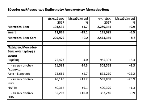«Το 2017 τα Mercedes-Benz Cars παρέδωσαν περισσότερα από 2,4 εκατομμύρια αυτοκίνητα Mercedes-Benz & smart στους πελάτες τους παγκοσμίως. Αυτό σημαίνει, ότι ξεπεράσαμε το ρεκόρ πωλήσεών μας για 7η συνεχή χρονιά. Για ακόμη μία φορά, με τη Mercedes-Benz, τη βασική μάρκα του χαρτοφυλακίου μας, αποτελέσαμε την πιο ευπώλητη premium μάρκα και για το 2017. Ειμαστε περήφανοι γι αυτήν την επιτυχία και συνεχίζουμε να χτίζουμε επάνω της, καθώς αποτελεί γερό θεμέλιο για το αύριο. Η ισχυρή θέση του Ομίλου σήμερα αποτελεί τη βάση για την ενεργή διαμόρφωση της κινητικότητας του μέλλοντος! Το 2018 θα συνεχίσουμε να πορευόμαστε σε αυτό το μονοπάτι με το CASE (Connected, Autonomous, Shared & Electric).» δήλωσε ο Πρόεδρος του Ομίλου Daimler και επικεφαλής των Mercedes-Benz Cars, Dr. Dieter Zetsche.
