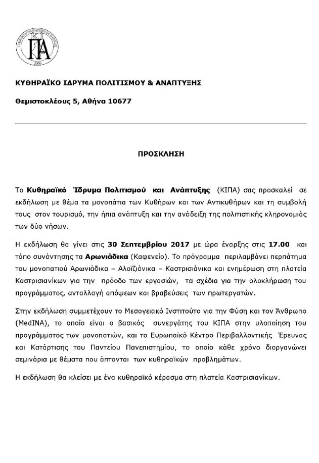 - Πρόσκληση για Περίπατο στο Παραδοσιακό Δίκτυο Μονοπατιών των Κυθήρων, διαδρομή «Αρωνιάδικα – Αλοϊζιάνικα – Καστρισιάνικα», 30 Σεπτεμβρίου 2017