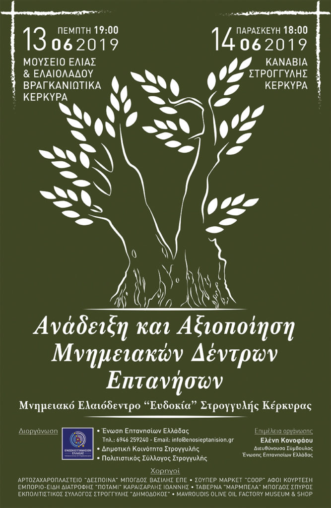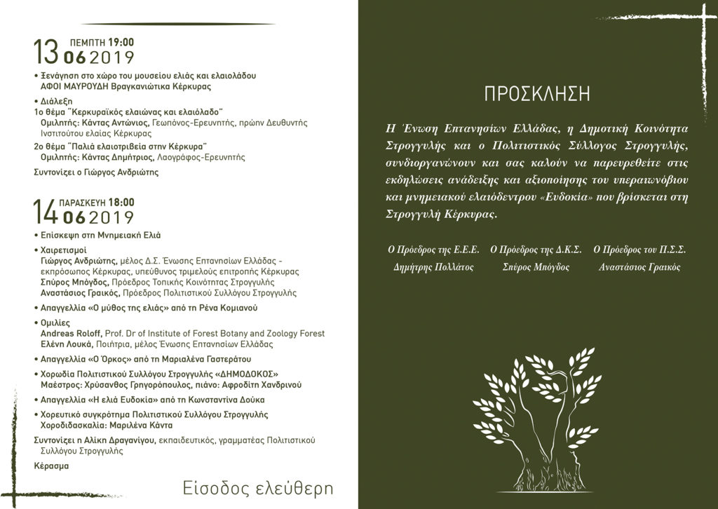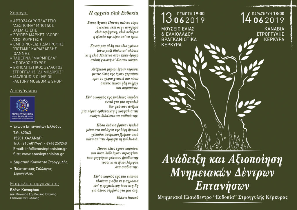 Με την πεποίθηση ότι η προστασία του περιβάλλοντος δημιουργεί σημαντικό κίνητρο για την ανάπτυξη του πολιτισμού και της περιβαλλοντικής συνείδησης, η Ένωση Επτανησίων Ελλάδας σε συνεργασία με τη Δημοτική Κοινότητα Στρογγυλής και τον Πολιτιστικό Σύλλογο Στρογγυλής Κέρκυρας, διοργανώνει διήμερες εκδηλώσεις για τη μνημειακή ελιά «Ευδοκία»* κατά το διήμερο 13 και 14 Ιουνίου 2019 στην Κέρκυρα.
